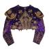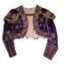 Boléro in a purple silk satin with gold thread embroidery and metallic sequins throughout in botanical fernlike motif with flowers up the arms, chest and back. Metallic gold threaded pompoms embellish the trim and epaulettes, also embroidered with metalic sequins and flowers. The back features a central pentagonal shape in sequins and gold thread from which flowers grow. Traditional matador costume, traje de luces (suit of lights). Stage use.
