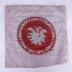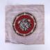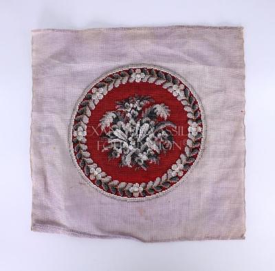 Circular embroidery constructed of white, black and grey glass beads on red berlin wool work and purple toole backing. The embroidery features a central grey foliate motif on a red background encircled by a white and black laurel.