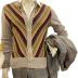 Woolen disco-style cardigan with beige sleeves, ribbed collar, button placket and wide belt at the bottom, the front is knitted in diagonal brown-green-red-yellow-beige stripes.