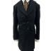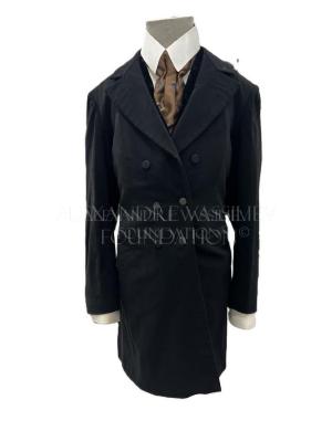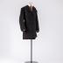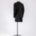 Men's black wool flannel jacket, double-breasted, with covered satin buttons, waist cut-off with rear Viennese seams, two rear box-pleats with two buttons on the tails, and full length vent from the waist between the pleats.