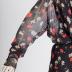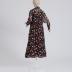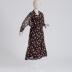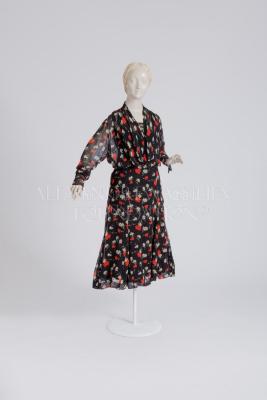 Black chiffon printed with small poppies and daisies midi-dress, the bodice with a draped shawl collar has a snap fastening at the center front to the waist and on the left side; long sleeves have snap fastenings with small bows at the bottom; a flared six-gore godet skirt; a separate black damask silk princess-cut slip on velvet straps with a wide black cotton lace stripe at the top and a ruffled hem.