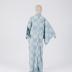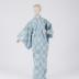 A pale blue cotton kimono with a checkered pattern, alternating dark blue bold squares with macro floral printed squares and abstract mesh printed squares. A kimono neckline lined with white muslin, the inner seams trimmed with the same fabric.