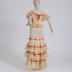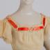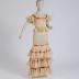Scenic dress (probably Spanish) in Ivory organdy with cotton lace trimming in the same color and orange satin ribbon pulled through it. The corset bodice with rear hook-and-eye fastening, that decorated with a bow at the rear neck, has a square neckline trimmed with lace, double flutter sleeves of organdy and lace underneath and lushly gathered organdy peplum. The organdy skirt rear closed with hooks and additional ties, has three tiered ruffles with a rigid edge in the lower half, embellished with lace and ribbon by the line of the attachment, the lace strip decorates the center of each ruffle. The cream silk underdress has spaghetti straps of grosgrain ribbon.