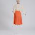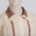 Ivory crepe de chine blouse with a peaked turn-down collar embroidered with folk motif in red, yellow and green threads, with cut-off shoulders and gathering underneath, long gathered sleeves on the cuffs, embroidered with the same pattern; embellished with two stripes of embroidery along the placket with a hidden shirt button-fastening.