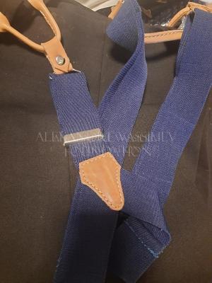 Wide blue elastic braces with orange leather details and white metal clamps.