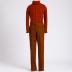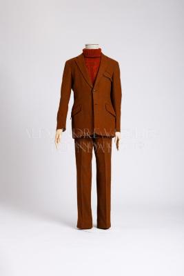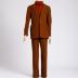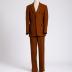 Men's suit made of dark brown wool cloth in a dark blue window pane checks, that features single-breasted elongated jacket closed with 2 buttons, with moderate lapels, deep rear vent, two slanted flapped pockets at the foreparts, single breast flapped pocket; and straight trousers with semicircular horizontal welt pockets at front.