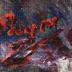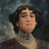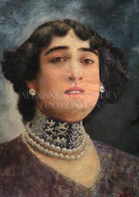 Portrait of Carolina OTERO, "La Belle Otero", done as an overpainting of a photo in oil on canvas. She is wearing a purple dress with white trim around a V neckline, and two gold and diamond earrings. Around her neck is an embroidered and jewelled blue choker with two strands of white pearls.