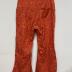 Orange flared trousers in a paisley printed blended twill, zip fastened at the center front with a black button at a waistband, atelier work, have half-moon pockets at front and patch ones at the back.