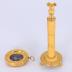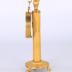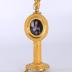 Gilt bronze stand and frame for miniature portrait. The stand takes the form of a column with a round base on three lions feet, embellished with palmettes. The column features knurling spaced between four rings. Atop the column is an eagle perched on an egg, with a hook and bow protruding from its mouth. A ring is screwed into the ovular frame which hangs from the hook. The frame is filled with plaster and features a convex glass protector. Underneath the base of the column a square washer and through rod is visible.