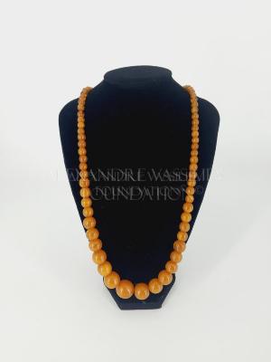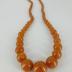 Necklace of graduated round melted amber beads, princess length, with screw clasp. Made in 1970s similar to 1920s.