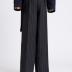 Grey wool formal trousers with textured black stripes and deep waist pleats at front.