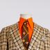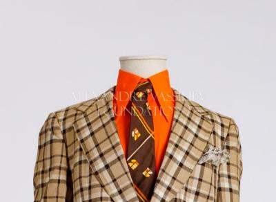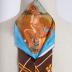 Brown silk twill peek-a-boo necktie with yellow-brown-white geometrical rapport, has a hidden pin-up girl portrait inside, with rayon silk lining. One of the signs of the sexual revolution beginning.