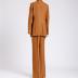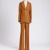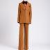 Brown linen women's suit consists of hip long, narrow, single-breasted jacket and flared trousers. The jacket has wide notch lapels with sharp angles up; closed on one golden plastic button with a logo; has two valve pockets and one chest welt pocket with a leaflet, two rear vents from the waist.