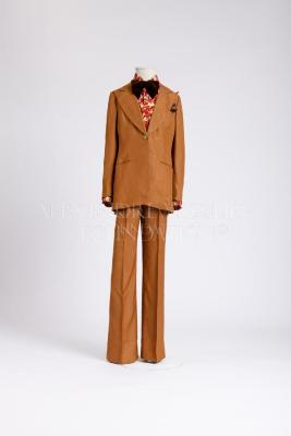 Accompanied by cinnamon-colored shirt with floral print, labelled “M 100% cotton”; brown cotton velvet bow tie and grey silk scarf with a horseshoe pattern (probably Hermes).