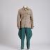 Tweed hunting jacket made of coarse grey tweed with fine orange and brown check, has a turn-down collar with sharp ends; two chest flapped patch pockets with box pleats, closed with buttons; two slanted valve pockets at the bottom of foreparts; sleeves with tabs and brown bakelite buckles; central front placket fastening with 7 buttons imitating tortoiseshell, and rear waist seam.