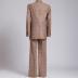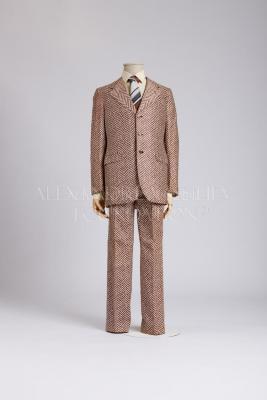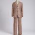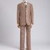 100% cotton twill suit in beige and white herringbone print with single-breasted jacket and straight trousers. The jacket with wide short notch lapels closed with three buttons, has three more on each sleeve, two flapped welt pockets on the foreparts and one flapped chest pocket; straight trousers have horizontal welt pockets at front and single back button pocket, fully lined.