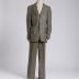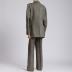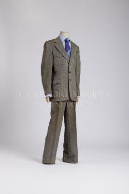 Grey tweed suit with a small diamond pattern consists of single-breasted jacket and slightly tapered trousers. The jacket has wide notch lapels, four rounded Western patch pockets with check mark-shaped flaps; closed with three buttons and has two more on each sleeve, also has a rear high vent from the waist; lined with dark blue viscose silk with woven light blue "BB" logos. Trousers are slightly tapered at the bottom, have two horizontal undercut pockets at front and two rear welt pockets, complemented by four oval leather pads inside the waistband - to prevent slipping on the shirt.