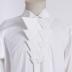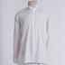 White cotton tuxedo shirt with two-button closed wing tip collar, woven satin stripes along the front placket with hidden fastening, long sleeves with turn-up cuffs, closed with mother-of-pearl cufflinks.
