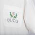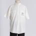 White cotton men's summer shirt with Italian spread collar, short sleeves, front placket fastening, two rounded chest patch pockets with turn-ups, on the left of them embroidered brand's logo.