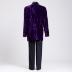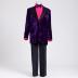 Ink violet crushed velvet tuxedo with black silk satin collar and wide peak lapels, closed with single button and has two more on each sleeve, also has two classic flapped pockets and one chest welt pocket, the foreparts are rounded at front.