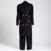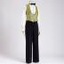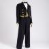 Servant's uniform from the Countess d'ALCANTARA family house. The livery made of dark navy blue wool gabardine is double-breasted and short to the waist at front, with three rows of gilded heraldic buttons with coat of arms engraved, has three rows of the same buttons on the rear box-pleats framing the high vent, and three more on each figured detail by the sides; the collar is trimmed with striped yellow-blue silk, the forepart bottoms adorned with the same silk triangular details. Uniform trousers made of dark navy wool gabardine with yellow piping and welt pockets in the side seams, have a rear half-belt with a gilded metal buckle, a fly fastened with buttons. A striped yellow-blue shantungsilk waistcoat with shawl collar, four gilded metal buttons, four welt pockets and ivory cotton lining and back, belongs to the overall suit.