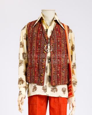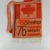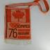 Rectangular orange synthetic jersey bag with metal zipper on top, long jersey strap, embroidered with orange, black and white plastic beads. The bag was made as a souvenir for the 1976 Winter Olympic Games in Montreal.