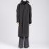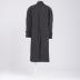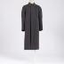 Men's duster coat of grey gabardine with black ribs. Has raglan sleeves, hidden fastening, two valve pockets, and a turn-down collar with a buttonhole on the right side. Lined with grey viscose silk.