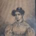 Charcoal and aquarel portrait of a woman with large puffed sleeaves, high waist, and collar with bow and ruffled neckline. She wears drop earrings and her hair in a bun style.
