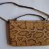 Python leather exterior and brown leather interior handbag with brass hinged clasp, zipper and slip pockets inside, accordion fold sides, short handle and long attachable strap.