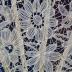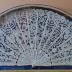White lace and mother-of-pearl stick ball or wedding fan. The fan comes in a wooden frame under glass on blue silk.