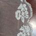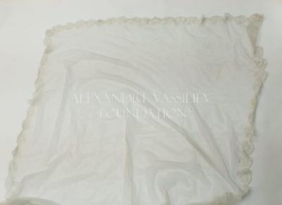 White tulle square neckerchief with whitework embroidery, scalloped edges, embellished with flouncings.