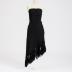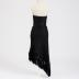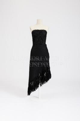 Black woolen knitted skirt with asymmetrical garter stitch and wide woolen fringe at the bottom, lined with black muslin.