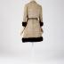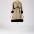 Two-piece women's suit with a sheath dress made of grey-beige silk brocade trimmed with black mink. Waist cut-off sleeveless dress has a wide scoop neckline, rear zip fastening, gathered by a slightly curved waistline skirt with the hem, which is trimmed with black mink; a waist-length jacket with long sleeves trimmed with mink, has a collar with small lapels and a hidden fastening with covered buttons.