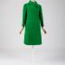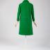 Green woolen cloth mini-coat, semi-fitted with a low waist, with an asymmetrical fastening on two large green plastic buttons, the turn-down collar is hemmed, has vertical welt pockets into the viennese seams, topstitched collar, waistline and foreparts with white thread.