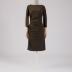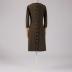 Umber-colored elastic wool twill day dress, semi-fitted at front and waist cut-off at the back, collarless with a boat neckline, knee length, has one-piece 7/8 sleeves with gussets, drapery along the right side seam, full-length rear fastening with black plastic buttons and welt loops, the buttons engraved with the house logo; lined with silk satin tone-on-tone.