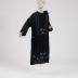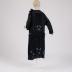 Black chiffon Art Deco evening gown with a low waist, long sleeves, gathered at the cuffs, a stand-up collar, which is edged with turquoise chiffon piping, and a bow made of black and turquoise chiffon on the left shoulder and a button closing on the left shoulder. Has false valve pockets at the bottom of the bodice, a wide facing line joining the bodice to the skirt and two box-pleats in the side seams of the skirt. The dress is embroidered with large plastrons on the chest and on the back, on the pocket flaps, by the cuffs and with a wide stripe along the hem in blue beaded flowers with dark red cores and a warty ornament made of black chopped beads.