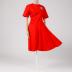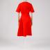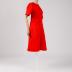 Coral red cotton with elastane summer shortsleeved dress, semi-fitted, collarless with a crew neckline, asymmetric vertical seam on the left side (front and back), the right side seam is draped with casing ties of the same material; has slightly flared skirt to the knees with an arched flounce on the right side; the bodice decorated with a coat of arms chest emblem, that is strewn with rhinestones and glass beads along the contour.