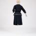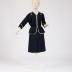 Black moss crepe dress with a semi-circular peplum and straight ¾ sleeves, decorated with white crepe ruches. The V-neck bodice is gathered to the waist, the slightly flared, below-the-knee skirt has a box-pleat from the center front and fastens with a metal zipper on the left side. The neckline, the center seam of the bodice at the front with two curls on the chest, the hem of the peplum and the cuffs are decorated with narrow ruches of white crepe.