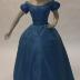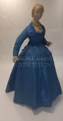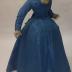 Nile blue silk taffeta crinoline four-piece ensemble with ball and day bodices. A spencer jacket with U-neck trimmed with a taffeta ruffles and blue silk ric-rac braid and infilled with ivory cotton cambric with pintucks, lace faggotings and tone-on-tone embroidery; the foreparts are edged with Chantilly lace and fastened in the center front with four blue soutache covered buttons, long tapered sleeves are trimmed with two rows of taffeta ruffles and lace cuffs. A ball corset boned bodice has a wide scoop neckline, a pointed hem, a rear lacing and short puff sleeves formed by box folds. Both bodices are lined with yellowed calico; a taffeta belt with a large bow and scalloped tails, that covers the crinoline skirt at the back, fastens with two hooks and eyes.