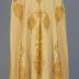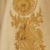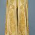 Cream felted wool cape in Ottoman style with metallic gold cordwork has a wide round collar, is lavishly decorated with couched and woven gold metallic cord in a pattern of botehs, shield forms and scrolling foliage; metallic button and loop closures with attached in the centers of side embroideries pendants with three balls of gold thread; lined in pale green shantung silk.