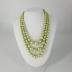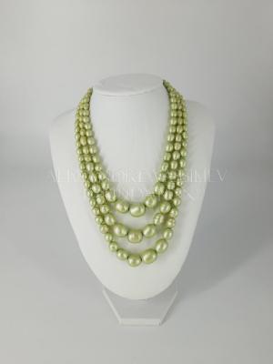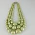 A triple strand necklace of graduated pale green cultured pearls, matinee length, with a white metal rectangular clasp set with transparent rhinestones.