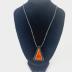 A triangular ceramic pendant made of dark brown clay with orange enamel in the middle, on a leather cord.