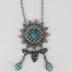 The three-piece "Egyptian Collection" jewelry set with white metal filigree mountings and turquoise ceramic scarabs. Consists of a white metal massive sun-shaped pendant on a long cable chain with a turquoise ceramic scarab mounted in the metal lattice center and two ones hanging below; and two white metal bracelets made of six rectangular parts each: on the first bracelet these parts are located lengthwise, on the second - crosswise, each part has a ceramic scarab mounted in it.