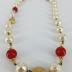 An opera length necklace made of uniform round nacreous white beads with crumpled surfaces, four coral imitating round glass beads, enclosed in small artificial pearls, and four gilded crumpled flat beads, with gilded brass bead cups, connected with brass jump rings and has a hook and eye clasp.