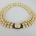 An ivory triple-strand necklace of graduated frosted pearly glass beads, matinee length, with a gilded brass snap clasp set with an ivory hemisphere.
