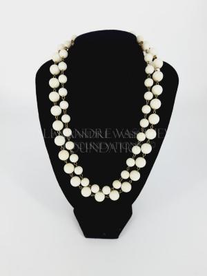 Double strand necklace of ivory bakelite iniform round beads, connected with gilded brass jump rings, matinee length, with a fold-over gilded brass clasp.