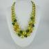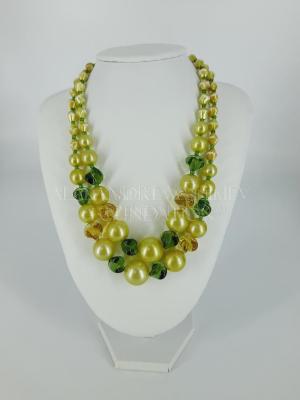 A two-strand necklace of graduated nacreous chartreuse round beads alternated with odd-shaped transparent green and yellow beads, matinee length, featuring a brass leaf hook clasp.