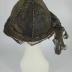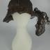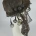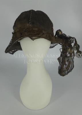 A cloche hat created by Erté for Les Folies Bergères, with a six-panel crown made of bronze lamé, stitched with bronze cord, decorated with bronze lace over the brim with a free hanging tail at the back, secured on the nape with a “bouquet” of transparent plastic balls braided with bronze veil