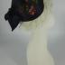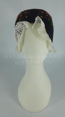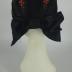 A traditional Swedish bindmössa cap made of black silk satin with machine embroidery in silk threads of stylized pink-red flowers with green leaves, decorated with a large rear black bow and a frill of white bobbin lace framing the face.