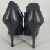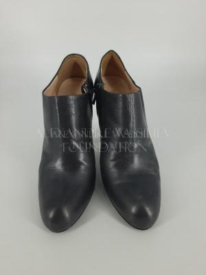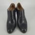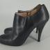 A pair of pearlised grey leather stortened ankle boots with rounded toes, side zip fastening and 10 cm high stiletto heels.